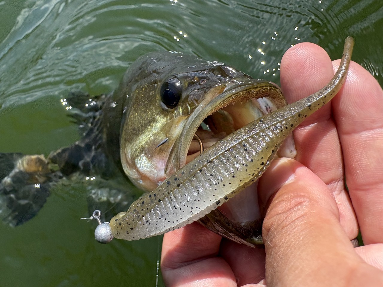 細かい横シェイクではピンテールを震わせ泳ぎ回る小魚を演出するナチュラルなアクションと、緩急をつけた使い分けが可能。