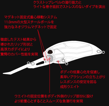 徹底したフィールドテストから得られたリップデザインとボディバランスにより、圧倒的なダイブ性能を備えながらもリーリングストレスは使い続けられる程度に調整。移動ウエイトをマグネットで固定し、更に固定ウエイトを加えることでブレの無いアクションレスポンスで狙ったレンジを確実にトレースします。