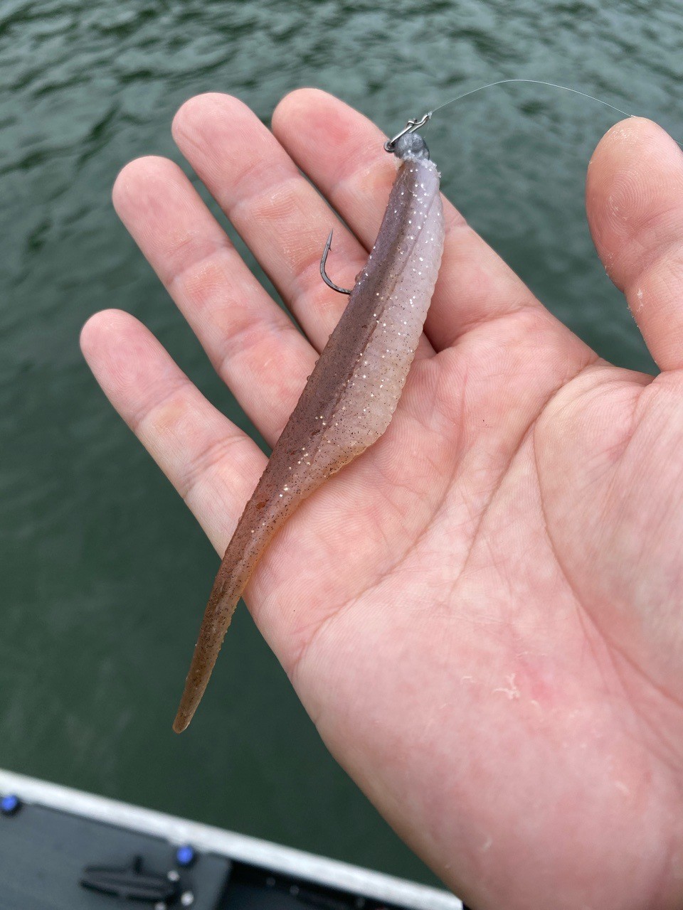 私個人的な考えで言えば、バスを探す第一段階ではルアーは大きな物から入ることが効率を上げるキモだと思っています。リグルクローラーのネコリグも5.8インチを多用するのはこの理由からです。