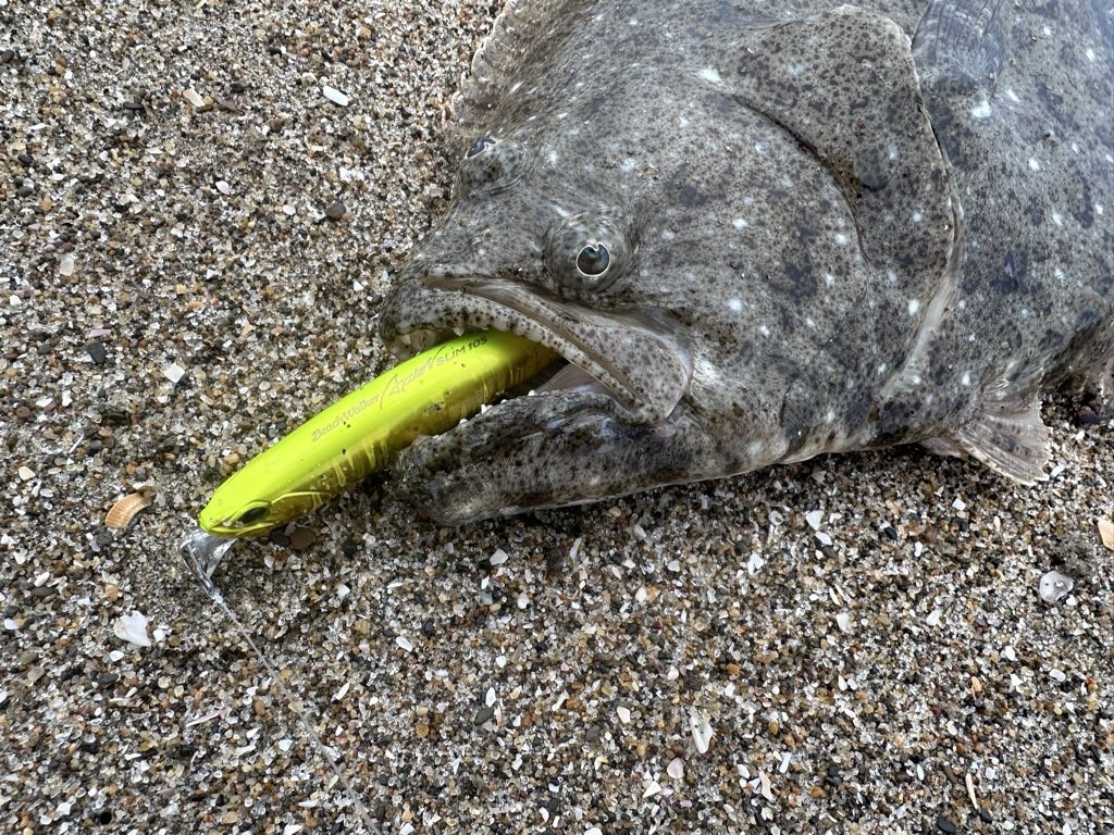 勿論最初はビーチウォーカー135MDで地形や流れを確認しながら狙って行きます。横の流れが強かった為巻きの釣りがメインに、探って反応が無かったので飛距離とレンジキープに優れたアクシオンスリム105を投入するとこのポイントに上手くマッチ!横に流されながらも巻きで狙っているとガツンとズッシリとしたバイトでヒット‼️今年はもうダメかと思った矢先に良型のヒラメをキャッチ出来ました‼️