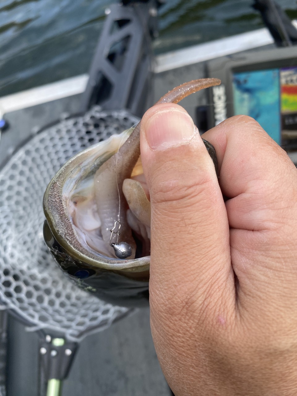 岩盤で水深がストンと落ちてるのでボートポジションは岸寄りに取り、ルアーを岩盤から着かず離れずの距離感で操作。