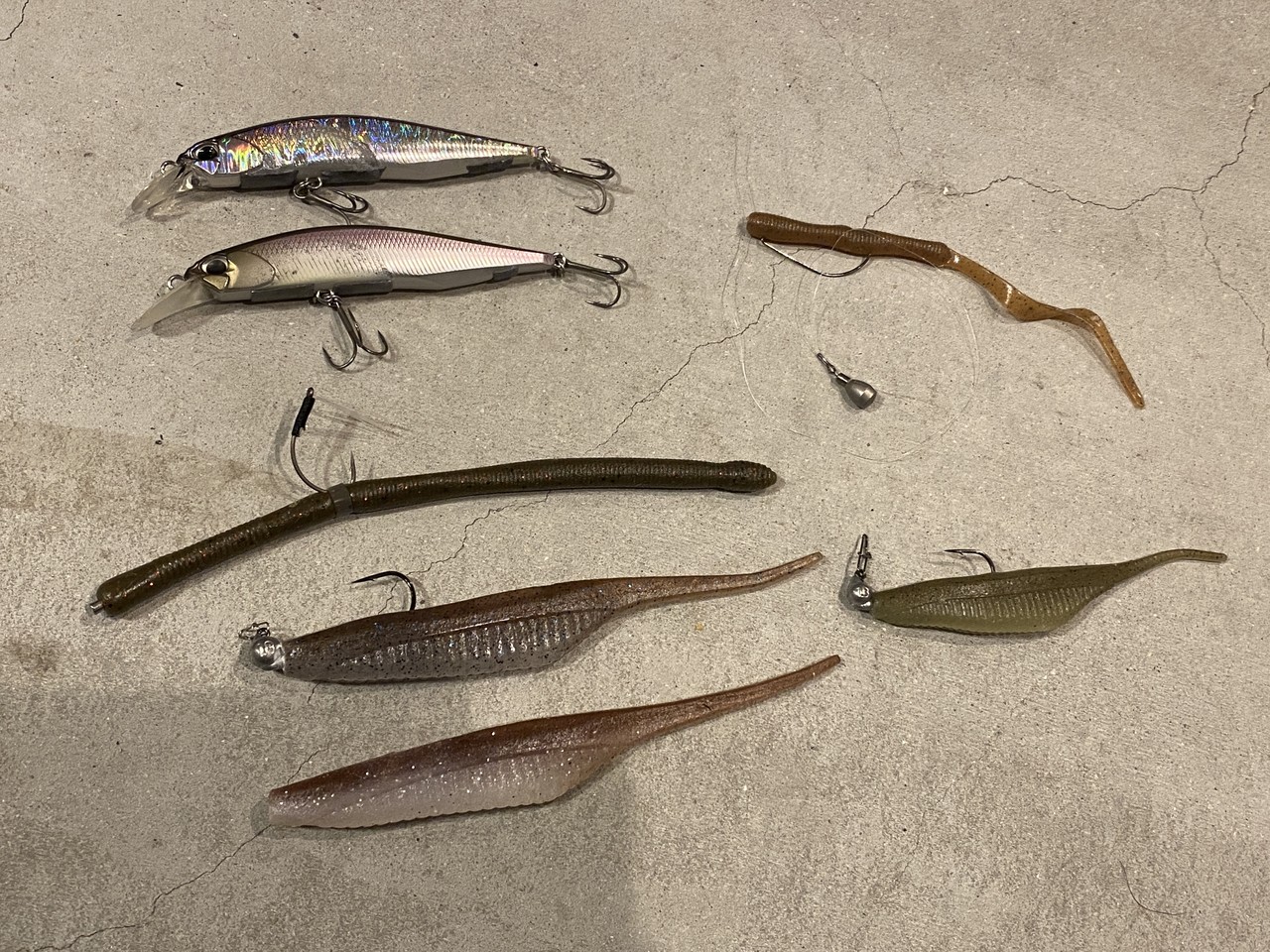 バーサピンテール5inをカラーチェンジしてみたり、バーサピンテール4inのミドスト、リグルカーリー3.8inのダウンショットとルアーローテーションをしてこのスポットだけで計7本キャッチ!
