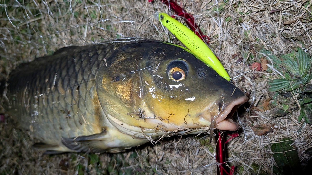 水面をライトをつけて確認するとちらほら大型のバチが泳いでいた。